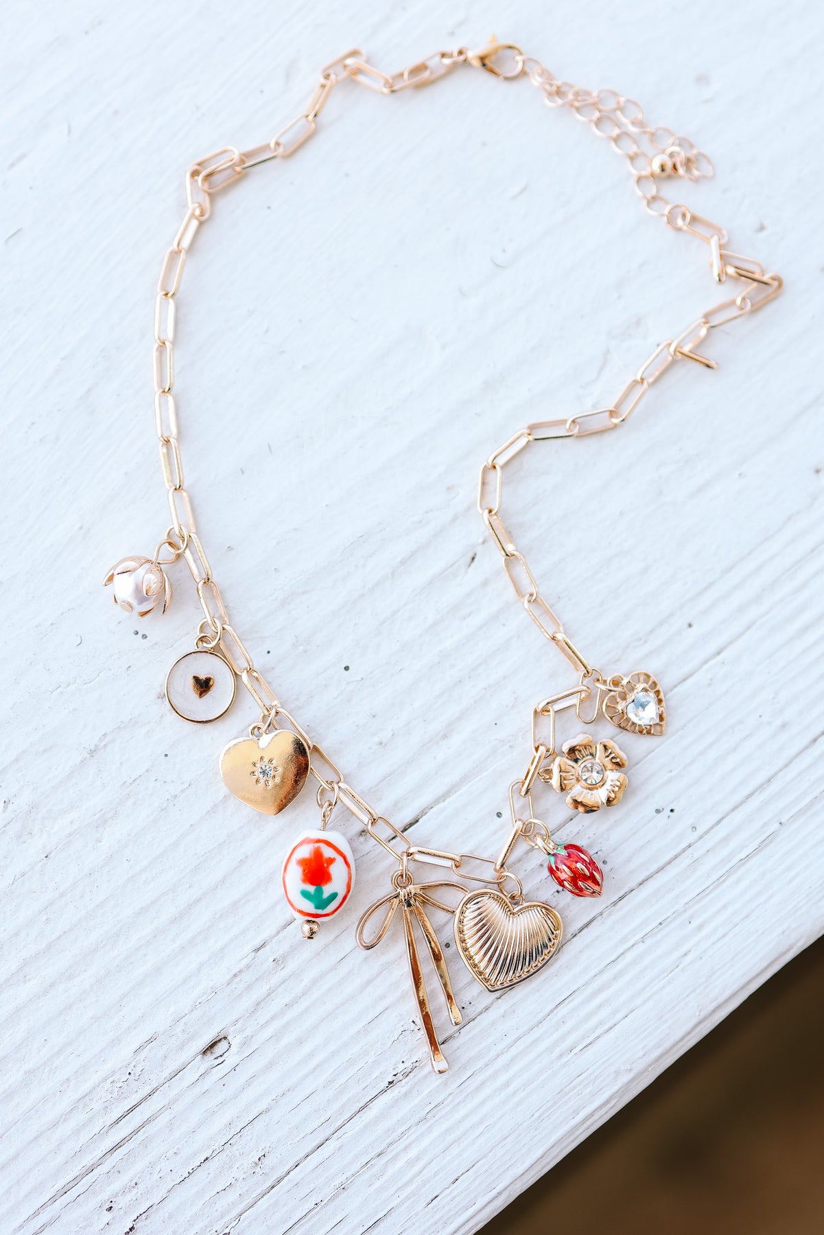 This stunning necklace features a delightful combination of charm elements, including a long bow, porcelain toile floral design, a gleaming gold heart, a vibrant red strawberry, and a dazzling rhinestone heart. The porcelain toile floral adds a touch of vintage elegance, while the gold heart and red strawberry bring in a fun and romantic flair.