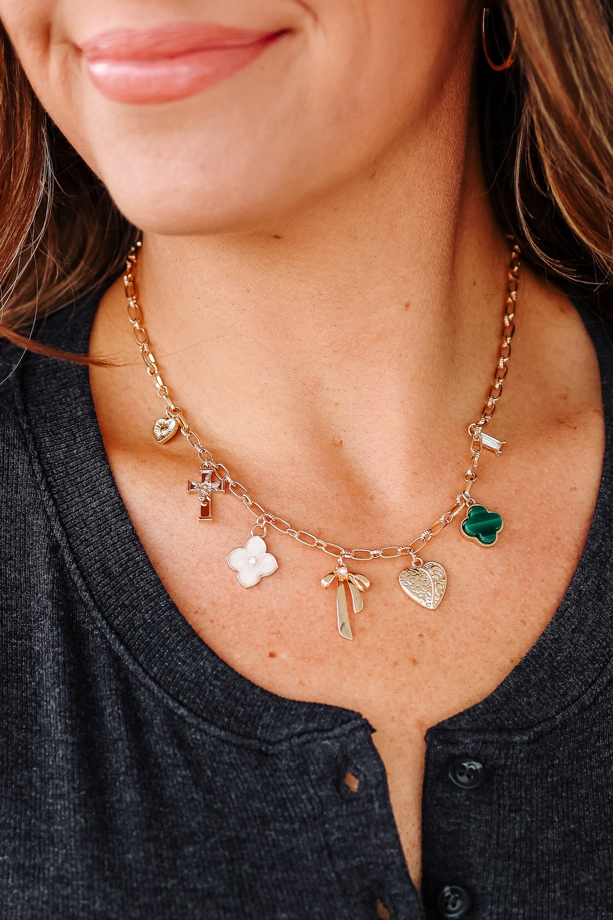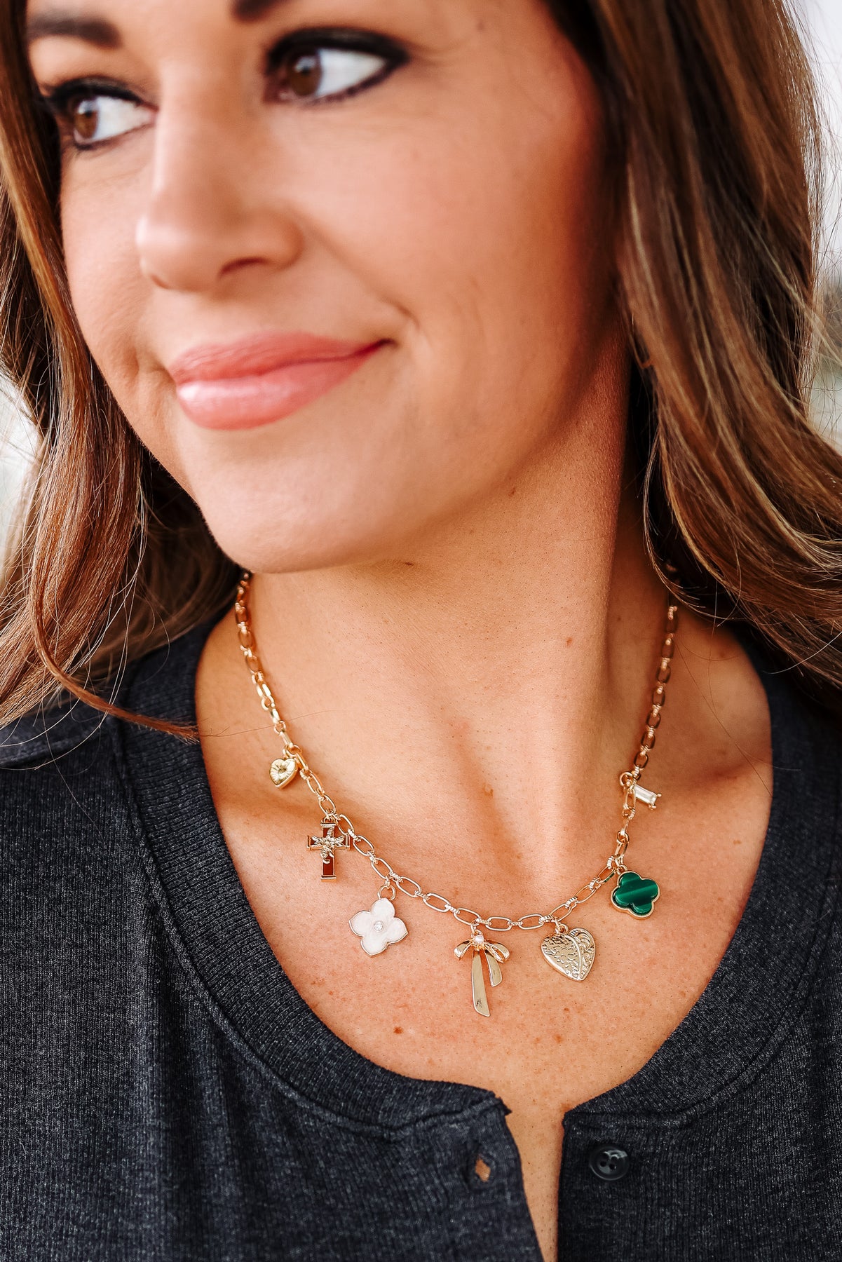 Featuring a thoughtfully arranged mix of symbolic charms, including a lucky clover, delicate flower, sweet heart, and playful bow.