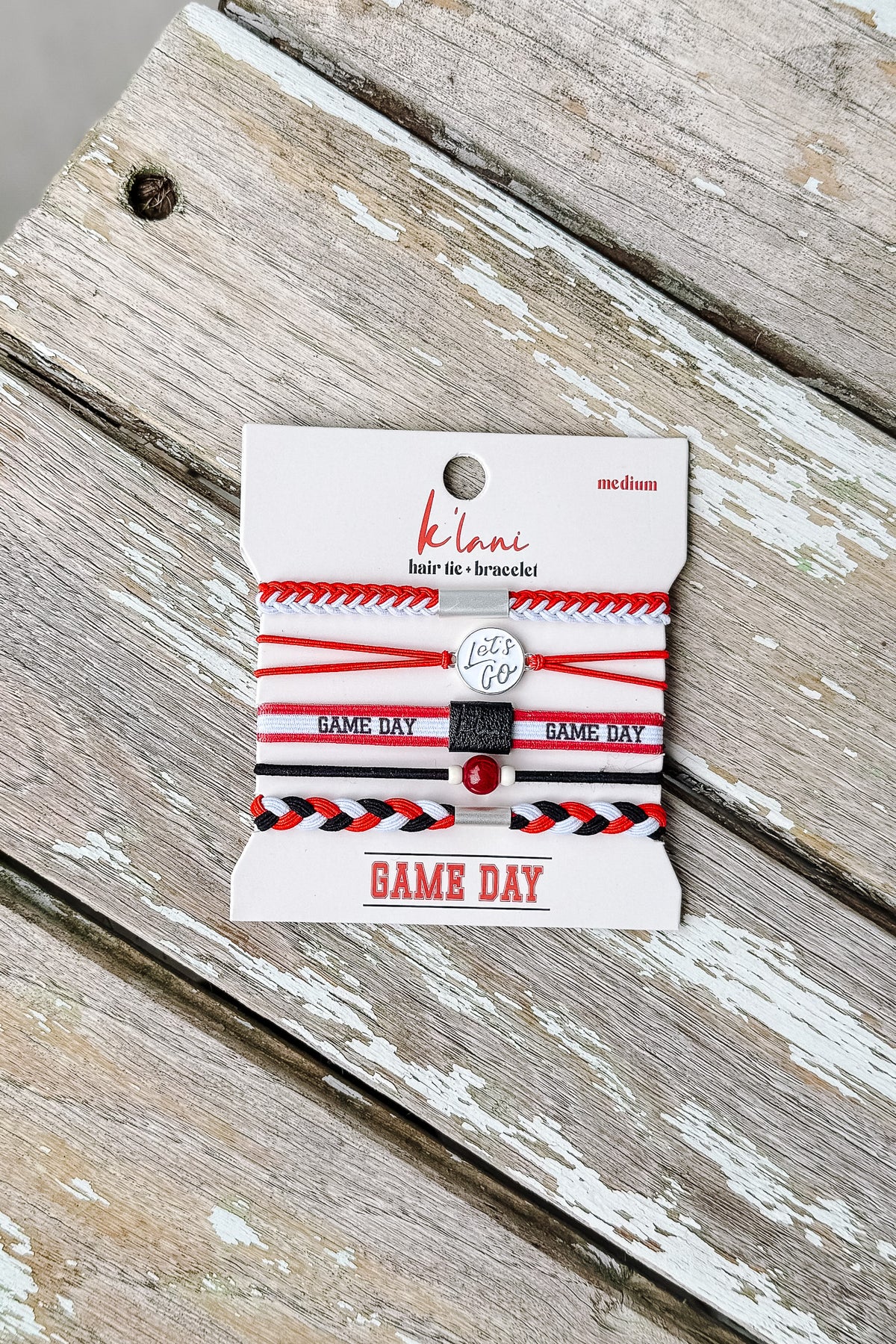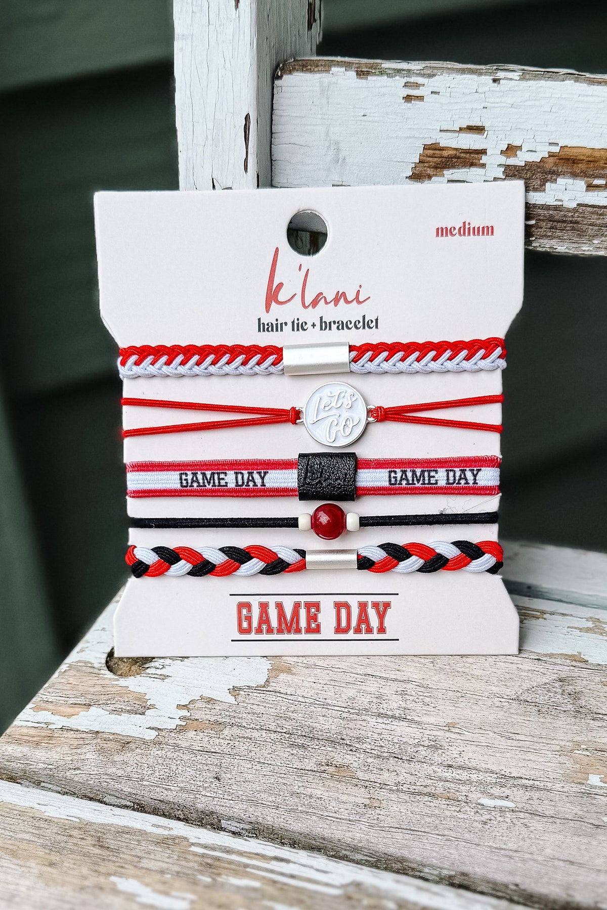 This Game Day set is made to show your school spirit with style and pride. These 5 hair tie bracelets feature bold team colors of red and white and are perfect for cheering from the sidelines or celebrating a win. With a “Let’s Go” charm and a natural stone bead accent, this set is a fun way to support your team and wear your pride on your wrist while ready to pull your hair up when the games gets intense.