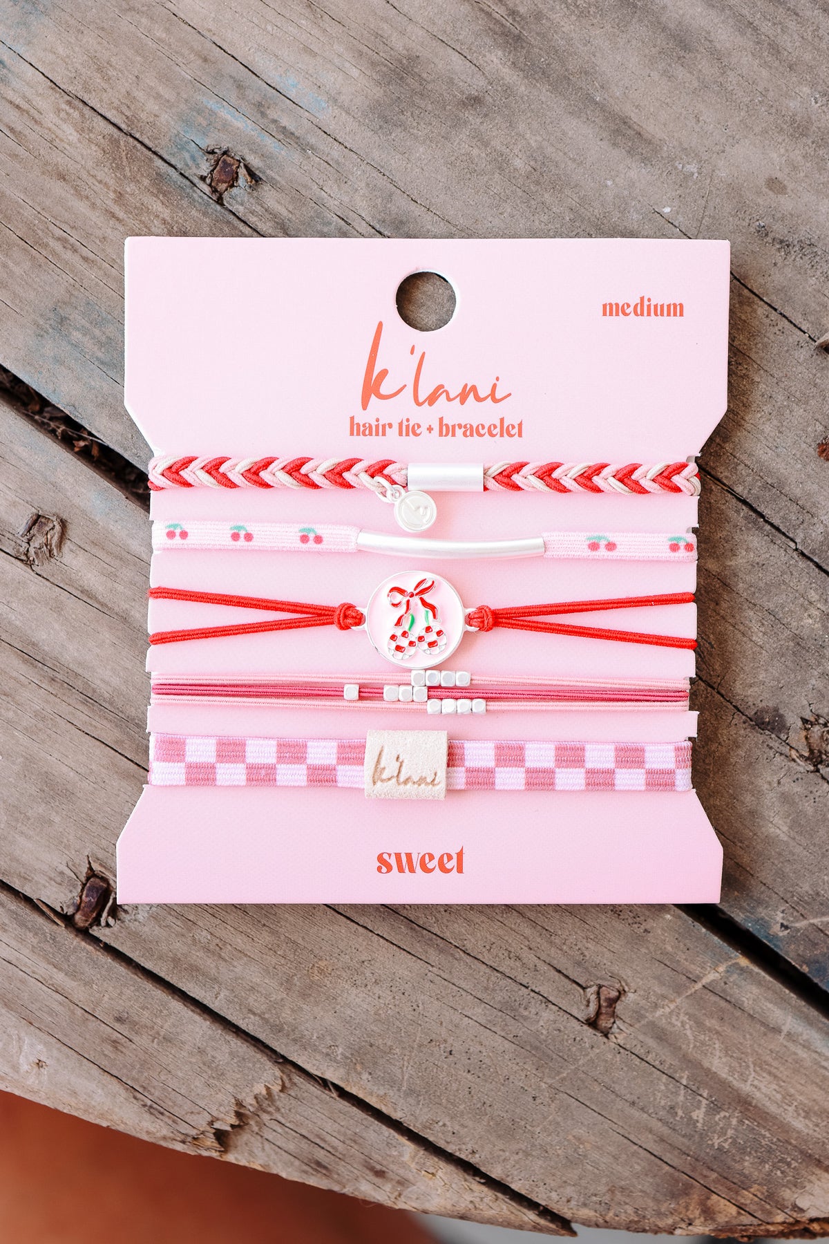 Our Sweet set includes 5 hair tie bracelets in fun coral, reds, and pinks. A touch of sweetness comes with the disco cherry charm and cute print. This set will surely remind us of fun and sweet summer days.