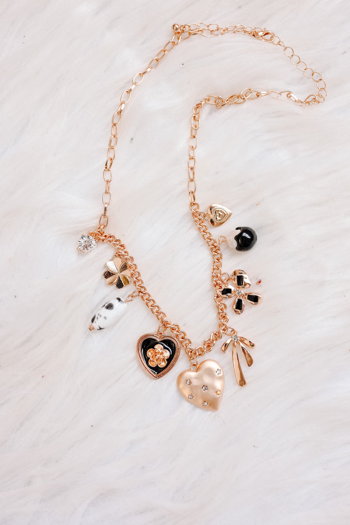 Charm Necklace features an elegant combination of a heart, bow, pearl, and flower charms. Lightweight and versatile, layering or wearing alone as a subtle statement piece.