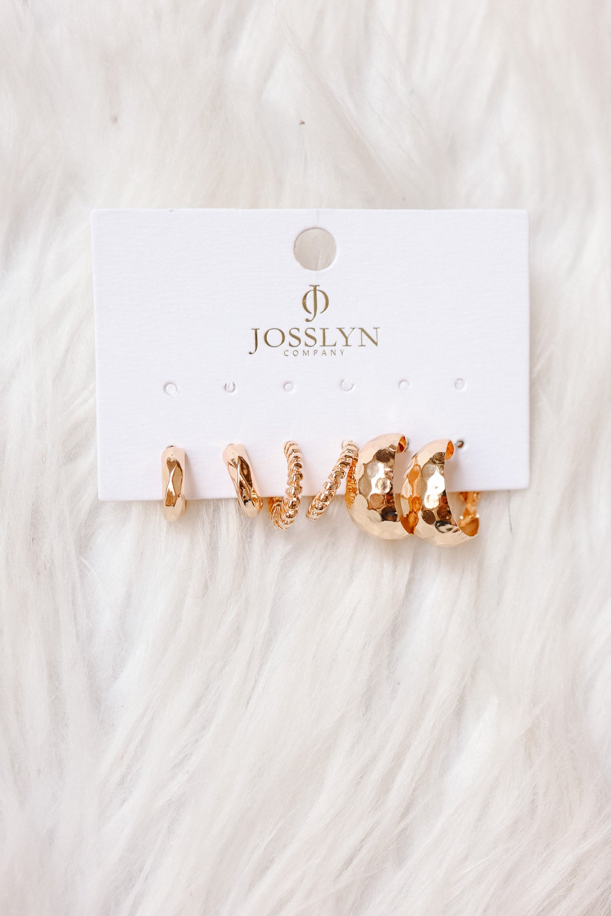 Set of gold-tone crescent hoop earrings in varied textures-smooth, twisted rope, and hammered-for effortless mixing and matching.