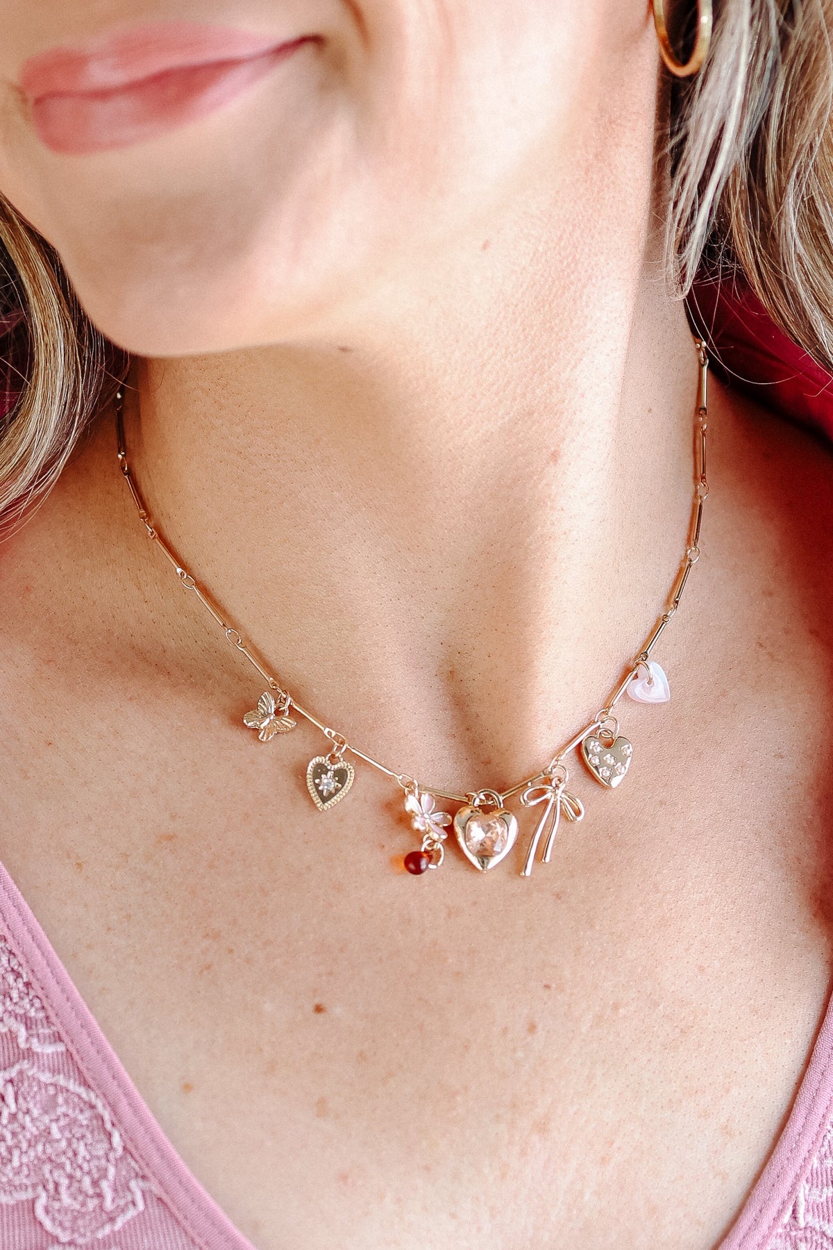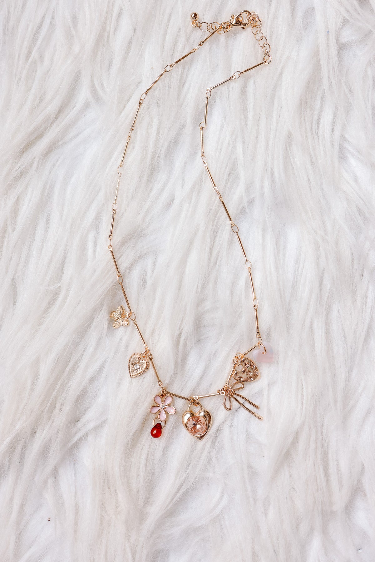 Charm Necklace a delightful mix of charms, including a Rhinestone heart, strawberry, flower, butterfly and heart charms, all beautifully strung on a sleek chain. The charm patterns brings a trendy, bold vibe, the heart represents love, and the rhinestone charm adds a bit of glamour and shine.
