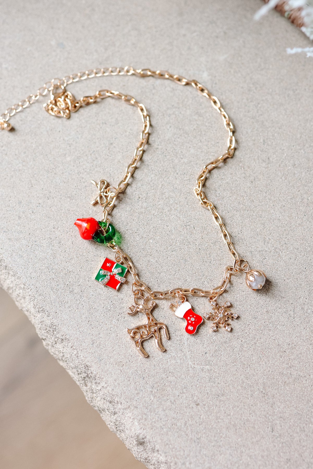 Charm Necklace, featuring a delightful mix of holiday, including Rudolph, a Christmas gift, sock, snowflake, and a delicate bow.