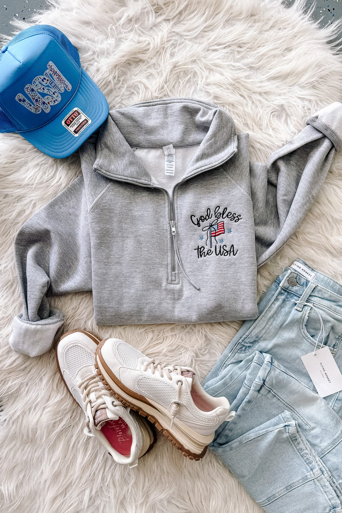 God Bless The USA Embroidered Half Zip - Athletic Heather