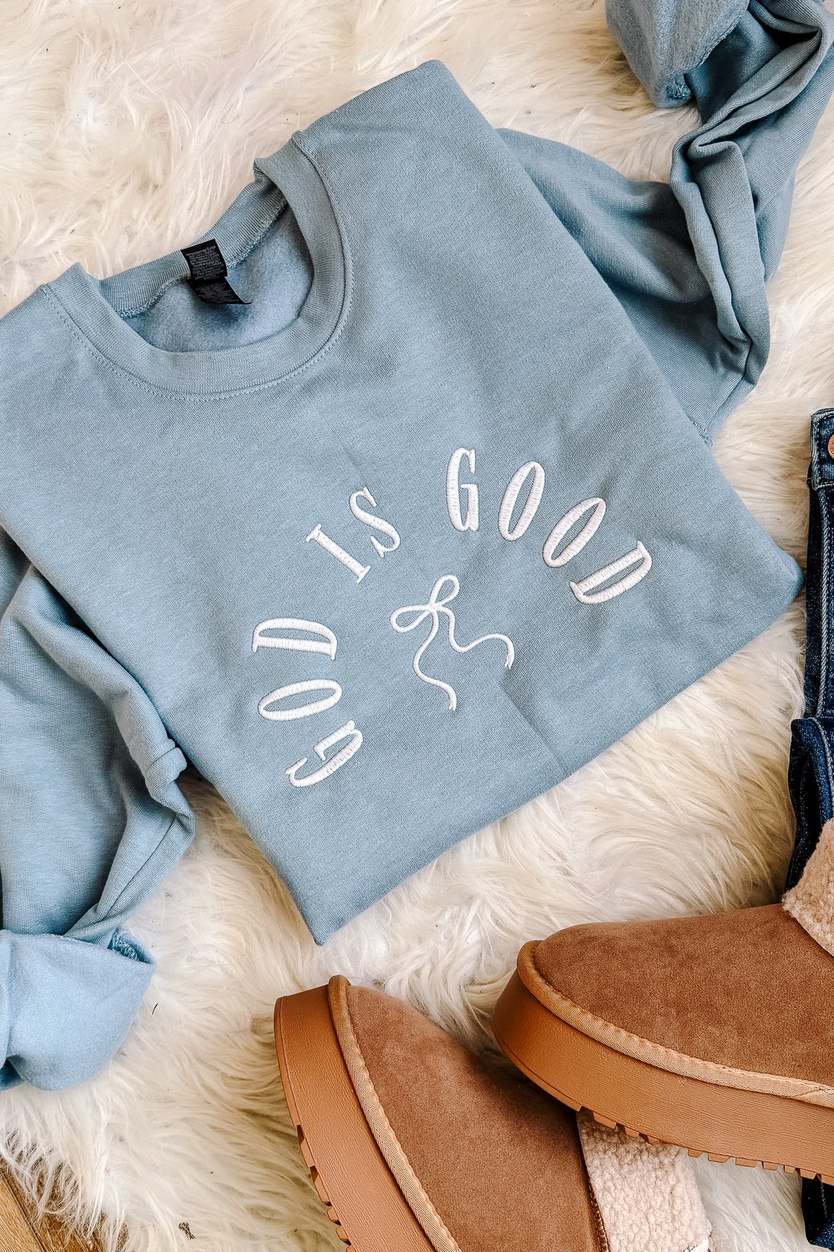 God Is Good Bow Embroidered Sweatshirt - Stone Blue