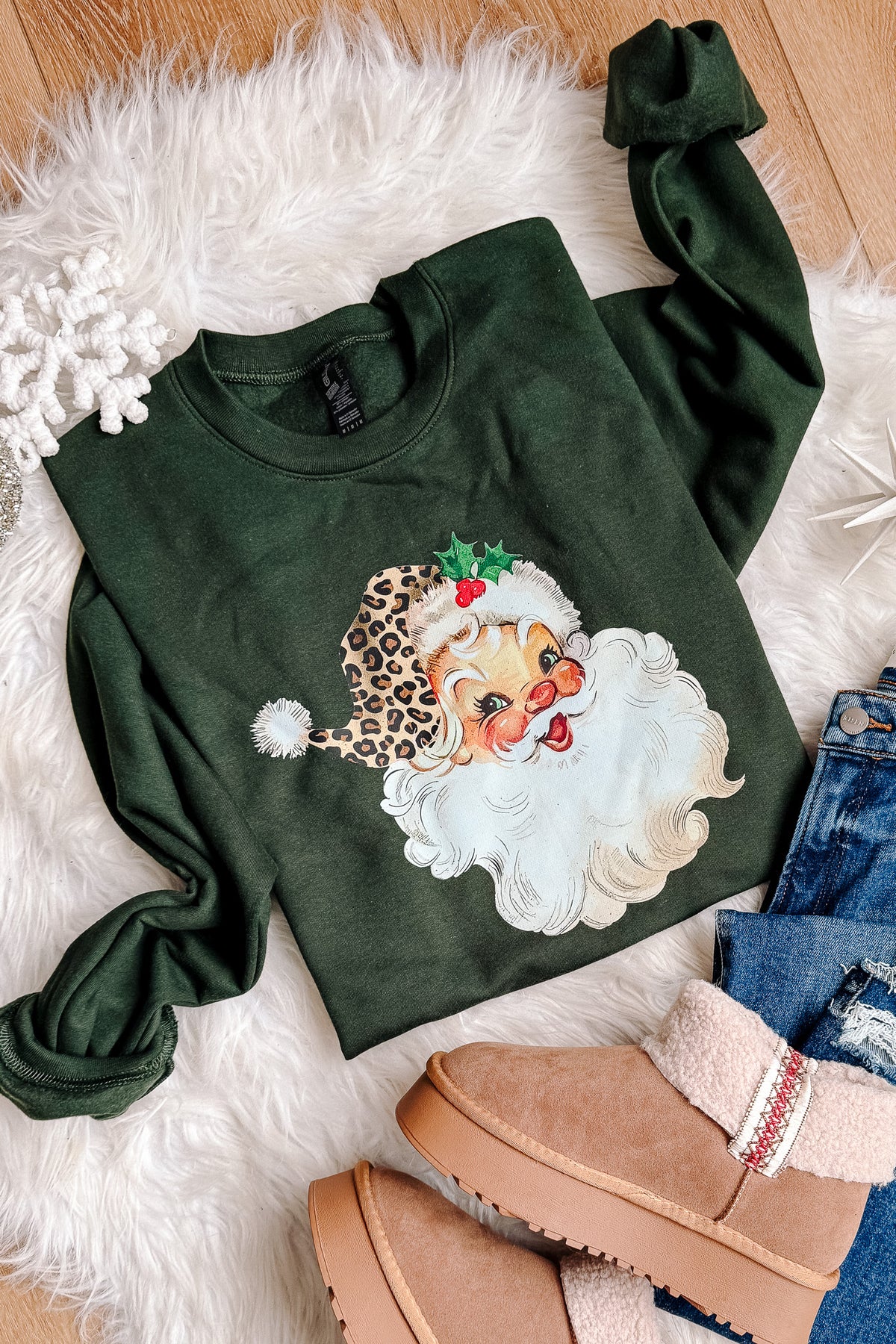 Leopard Retro Santa Graphic Sweatshirt - Forest Green