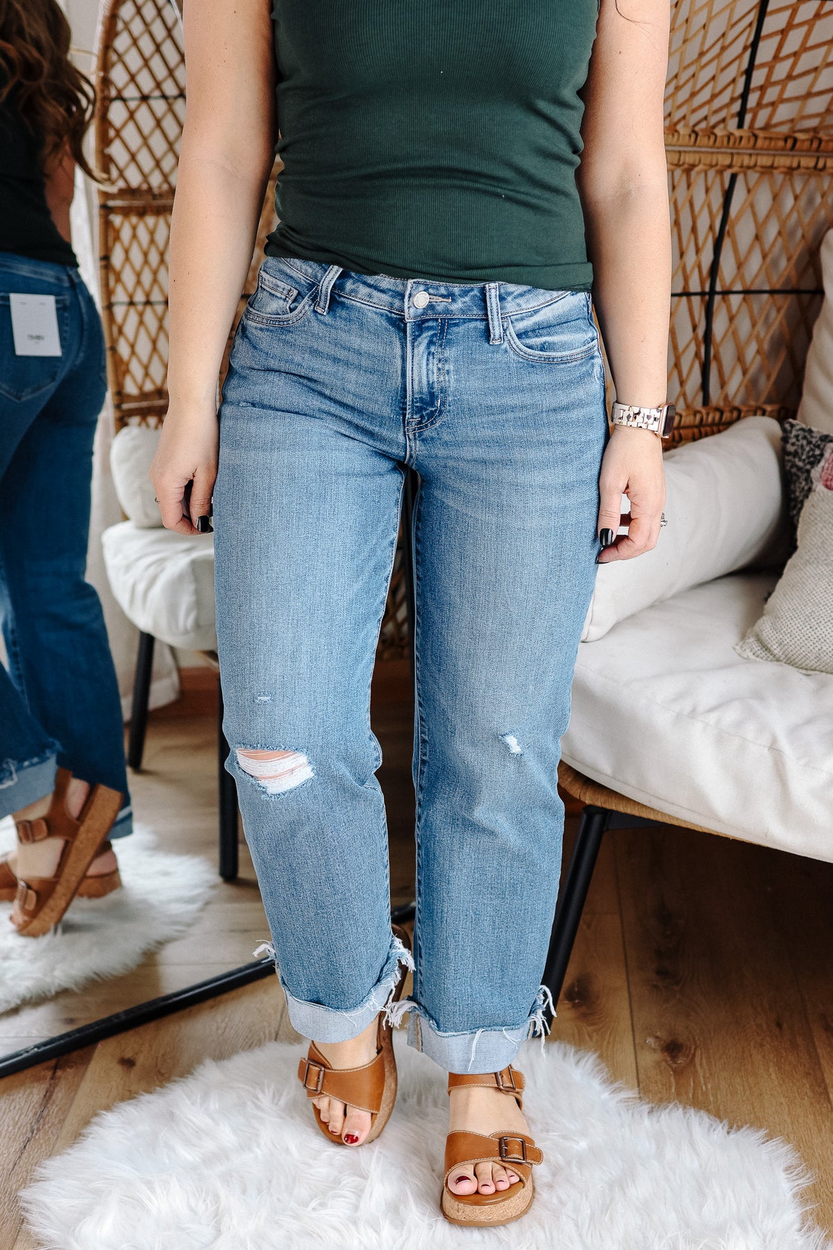 Fits true to size with a relaxed leg fit, model is shown in her typical size 5/27.