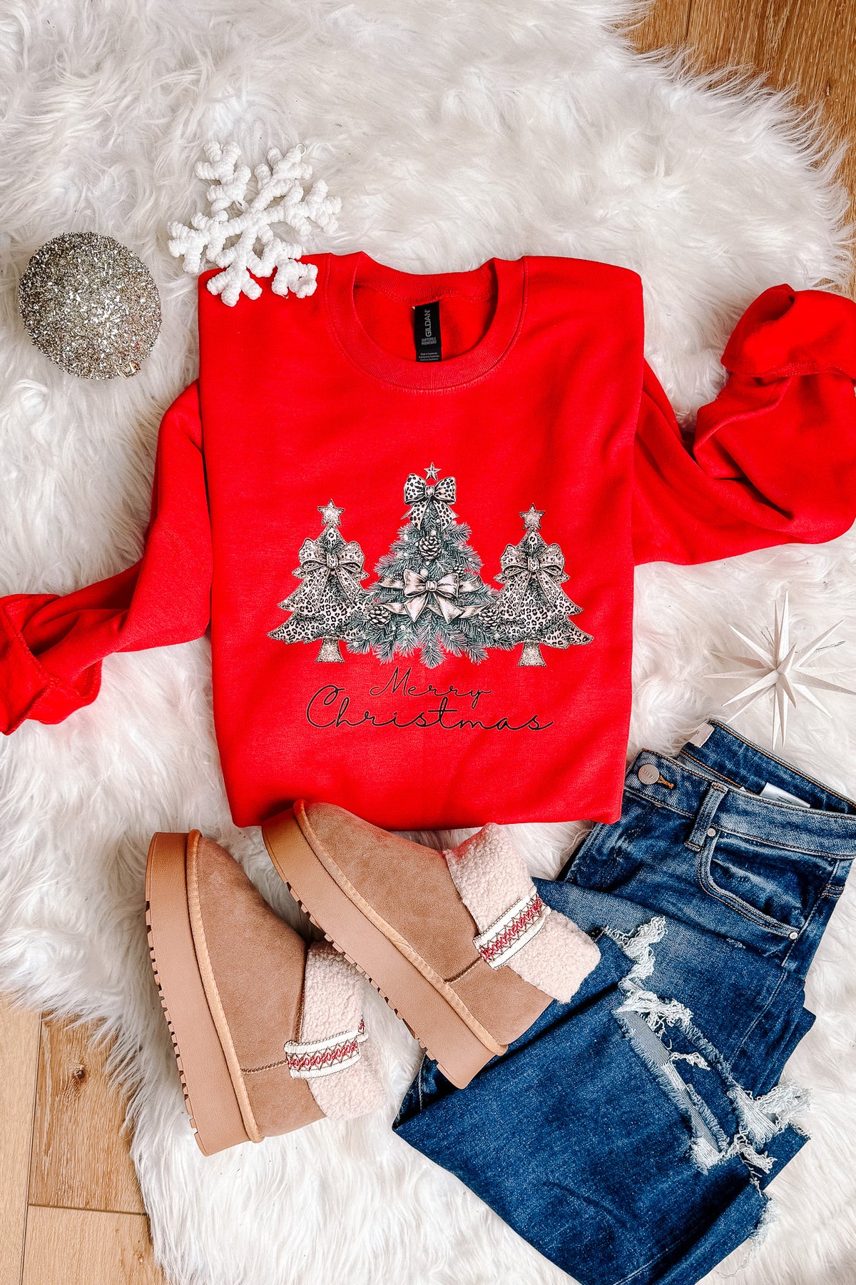Golden Leopard Christmas Trees Graphic Sweatshirt - Red