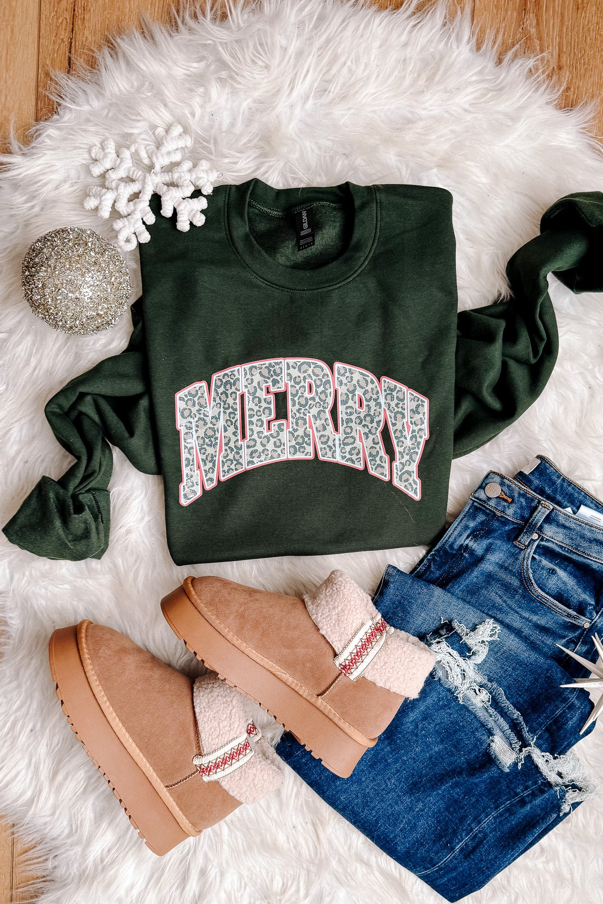 Leopard Merry Graphic Sweatshirt - Forest Green