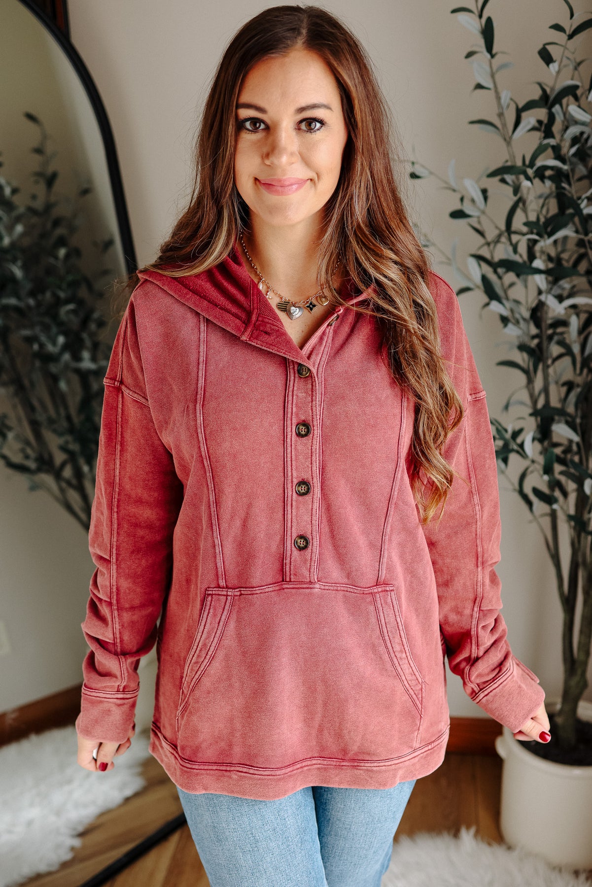 Elowyn Washed Tunic Hooded Top - Burgundy