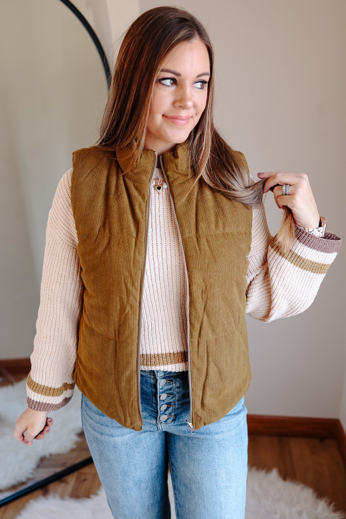 Essie Corduroy & Plaid Reversible Puffer Vest - Olive